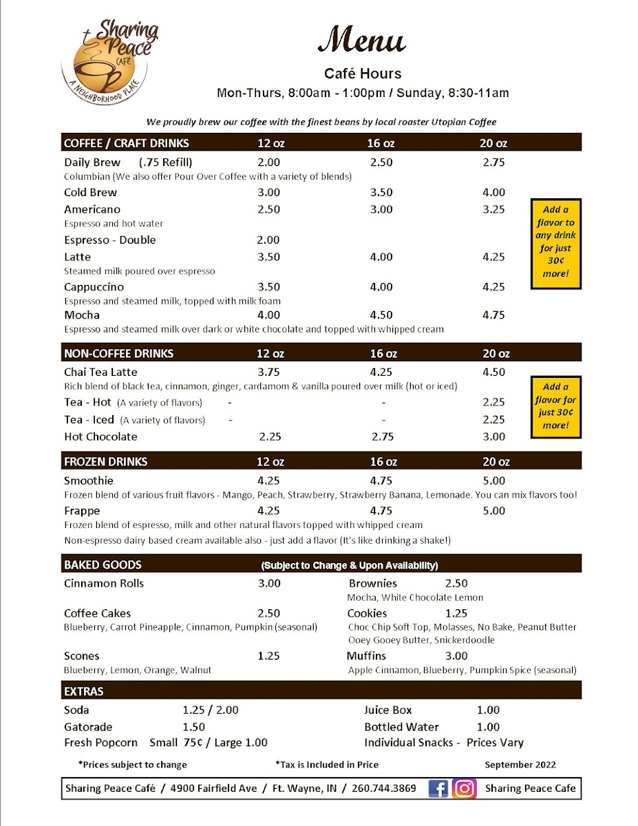 Welcome to Sharing Peace Cafe, a charming retreat located at 4900 Fairfield Ave, Fort Wayne, IN. This delightful café is not just a place to grab your daily dose of caffeine; it’s a community hub where warmth and comfort blend seamlessly with tantalizing flavors.